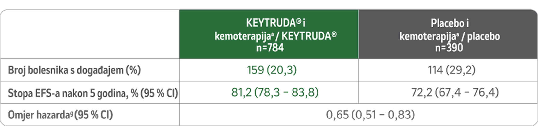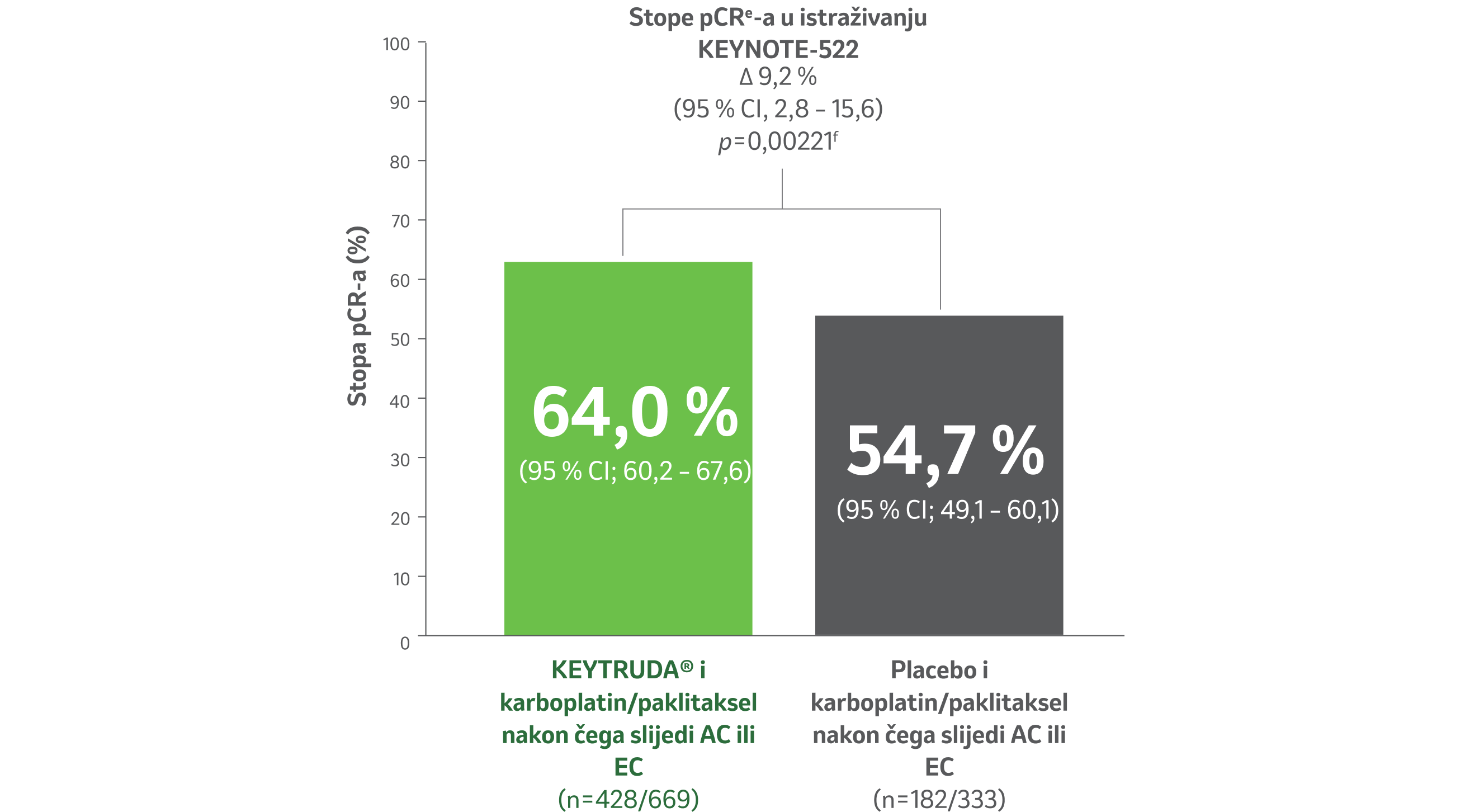 U prethodno specificiranoj konačnoj analizi (n=1002), 9,2% više je pacijenatad postiglo pCRe na režimu s lijekom KEYTRUDA® i kemoterapijoma u odnosu na režim s placebom i kemoterapijoma (95% CI, 2,8–15,6; p=0,00221f).