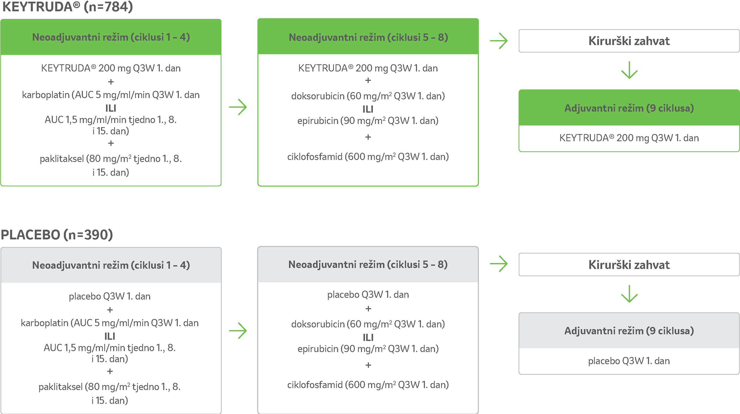bIspitivanje KEYNOTE-522 je randomizirano, multicentrično, dvostruko slijepo, placebom kontrolirano ispitivanje faze III u koje je uključeno 1174 bolesnika s novodijagnosticiranim, prethodno neliječenim visokorizičnim lokalno uznapredovalim ranim ili TNBC-om. Bolesnici su randomizirani 2:1 za primanje lijeka KEYTRUDA® u kombinaciji s kemoterapijoma kao neoadjuvantno liječenje nakon čega slijedi monoterapija lijekom KEYTRUDA® kao adjuvantno liječenje nakon kirurškog zahvata ili za primanje placeba i kemoterapijea kao neoadjuvantnog liječenja nakon čega slijedi placebo nakon kirurškog zahvata. Liječenje lijekom KEYTRUDA® ili placebom nastavilo se do dovršetka liječenja (17 ciklusa), progresije bolesti koja onemogućuje definitivni kirurški zahvat, recidiva bolesti u fazi adjuvantnog liječenja ili neprihvatljive toksičnosti. Primarne mjere ishoda djelotvornosti bile su patološki potpuni odgovor i preživljenje bez događaja. Ukupno preživljenje bilo je jedna od nekoliko sekundarnih mjera ishoda djelotvornosti.