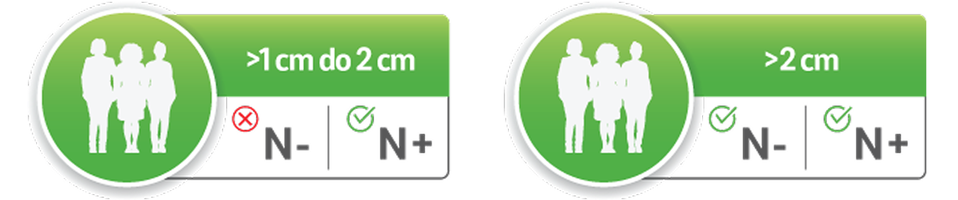- Veličina tumora > 1 cm ali ≤ 2 cm u promjeru sa zahvaćenim limfnim čvorom ili veličina tumora > 2 cm bez obzira na zahvaćenost limfnog čvora.