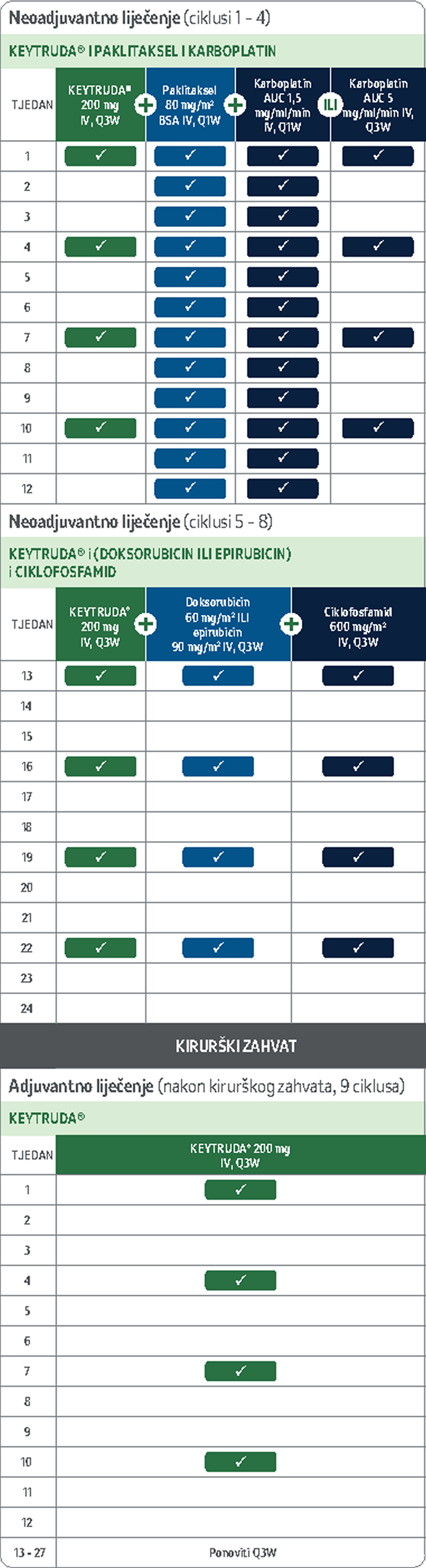Kada se lijek KEYTRUDA® primjenjuje kao dio kombinirane terapije uz kemoterapiju primijenjenu intravenski, najprije treba primijeniti lijek KEYTRUDA® u obliku intravenske infuzije tijekom 30 minuta. Za neoadjuvantno i adjuvantno liječenje visokorizičnog ranog TNBC-a bolesnike treba liječiti neoadjuvantnom terapijom lijeka KEYTRUDA® u kombinaciji s kemoterapijom od 8 doza od 200 mg jednom svaka 3 tjedna ili 4 doze od 400 mg jednom svakih 6 tjedana ili sve do progresije bolesti koja onemogućuje definitivni kirurški zahvat ili neprihvatljive toksičnosti, nakon čega slijedi adjuvantno liječenje lijekom KEYTRUDA® kao monoterapijom od 9 doza od 200 mg jednom svaka 3 tjedna ili 5 doza od 400 mg jednom svakih 6 tjedana ili do recidiva bolesti ili neprihvatljive toksičnosti. Bolesnici kod kojih je došlo do progresije bolesti koja onemogućuje definitivni kirurški zahvat ili neprihvatljive toksičnosti u vezi s lijekom KEYTRUDA® kao neoadjuvantnim liječenjem u kombinaciji s kemoterapijom, ne smiju primiti monoterapiju lijeka KEYTRUDA® kao adjuvantno liječenje.