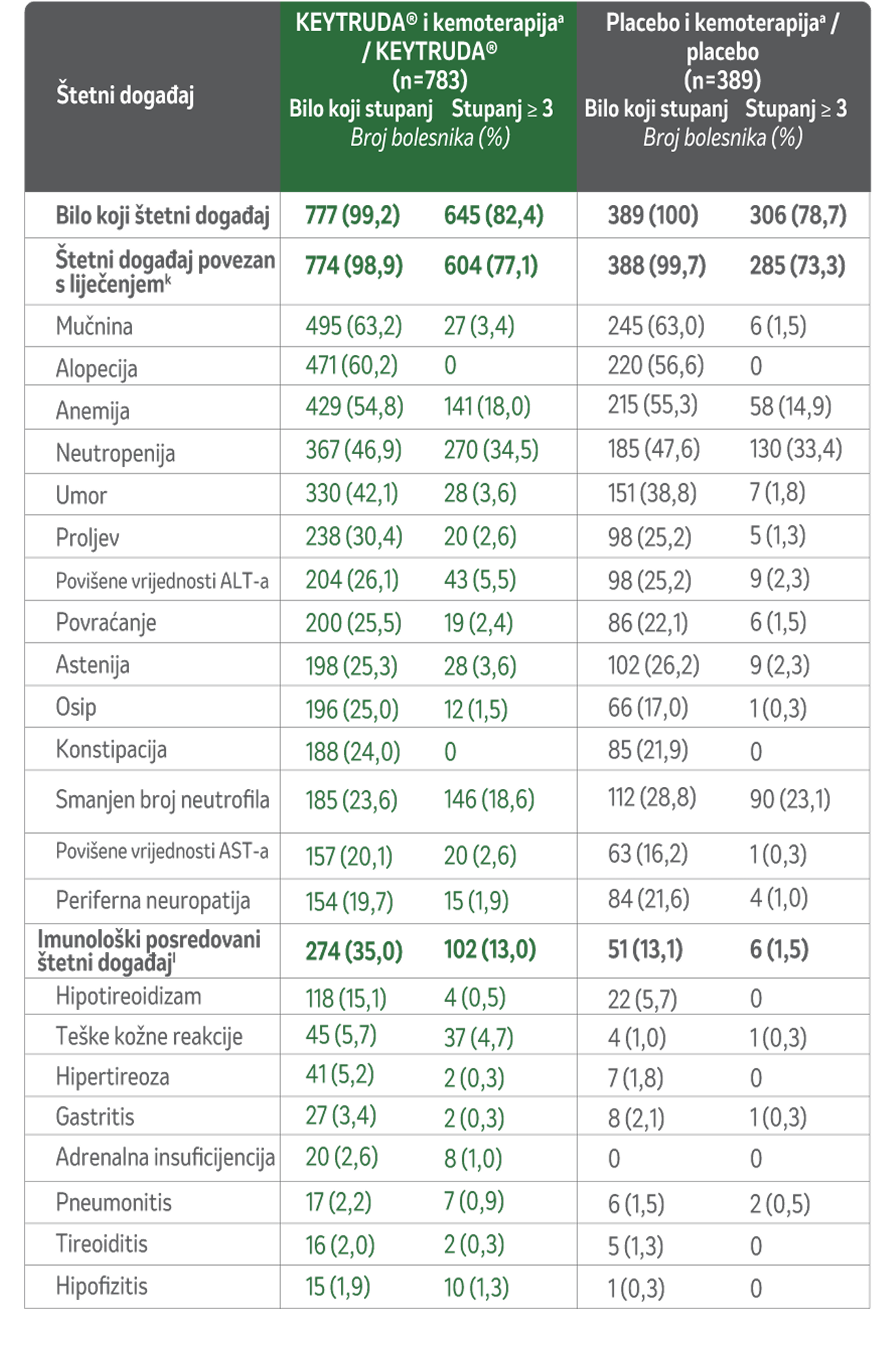 U bolesnika s visokorizičnim ranim TNBC-om koji primaju lijek KEYTRUDA® u kombinaciji s kemoterapijoma kao neoadjuvantno liječenje i nastavljaju s monoterapijom kao adjuvantnim liječenjem, ovdje navedeni štetni događaji javili su se tijekom ili unutar 30 dana nakon razdoblja liječenja (unutar 90 dana od ozbiljnog događaja) padajućim redoslijedom prema učestalosti u skupini koja je primala lijek KEYTRUDA® i kemoterapijua / lijek KEYTRUDA®. Liječena populacija obuhvaćala je sve bolesnike koji su prošli randomizaciju i primili su najmanje jedan lijek u sklopu ispitivanja, bili su podvrgnuti kirurškom zahvatu ili oboje. Težina štetnih događaja ocijenjena je prema CTCAE-u, verzija 4.0 NCI-ja.1