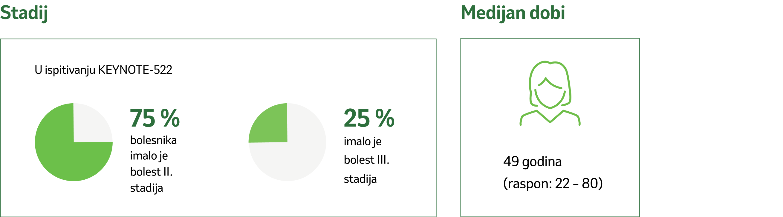 U ispitivanju KEYNOTE-522 procjenjuju se djelotvornost i sigurnost neoadjuvantnog liječenja lijekom KEYTRUDA® i kemoterapijoma nakon čega slijedi adjuvantno liječenje lijekom KEYTRUDA® u bolesnika s eTNBC-om.5