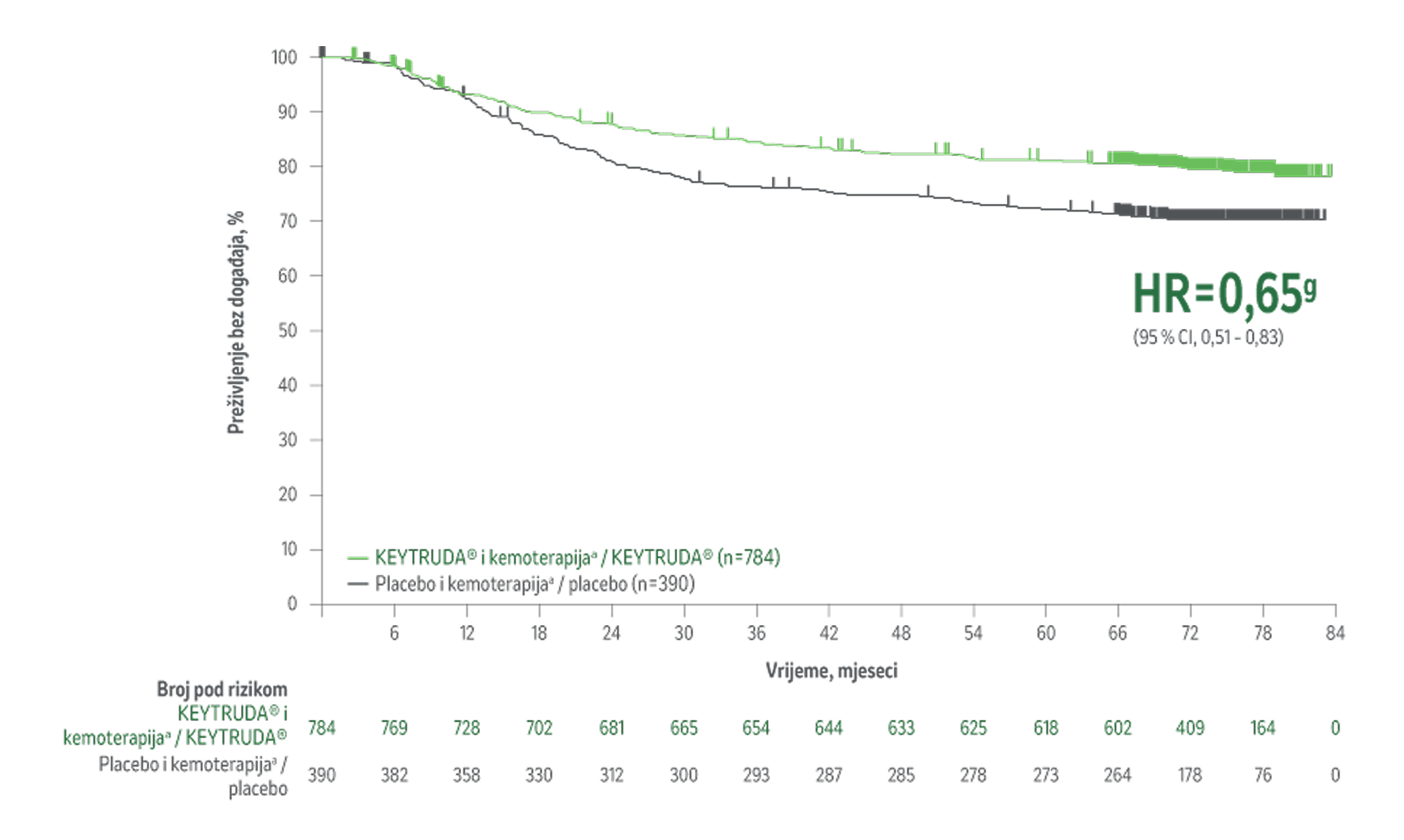 Broj bolesnika s događajem (n/N) bio je 115/784 (14,7 %) uz lijek KEYTRUDA® i kemoterapijua / lijek KEYTRUDA® naspram 85/390 (21,8 %) uz placebo i kemoterapijua / placebo.1