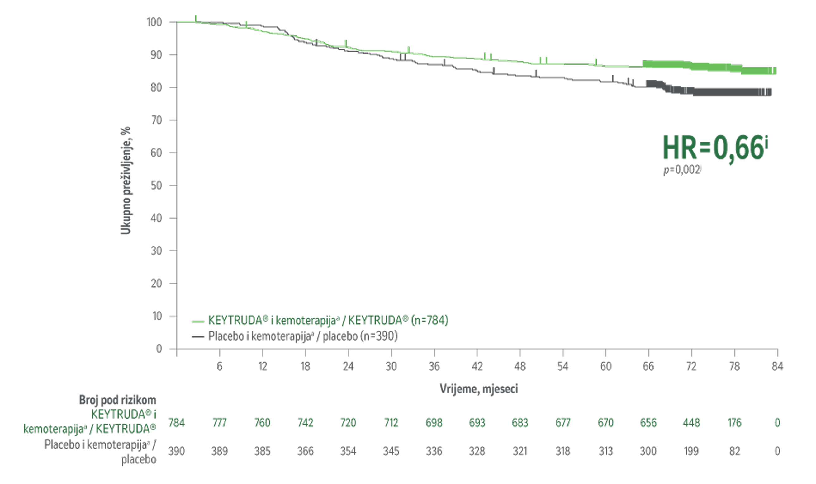 34 %-tno smanjenje (HR=0,66i; 95% CI, 0,50–0,87; p=0,002j) rizika smrti s lijekom KEYTRUDA® i kemoterapijoma / lijekom KEYTRUDA® u odnosu na placebo i kemoterapijua / placebo.