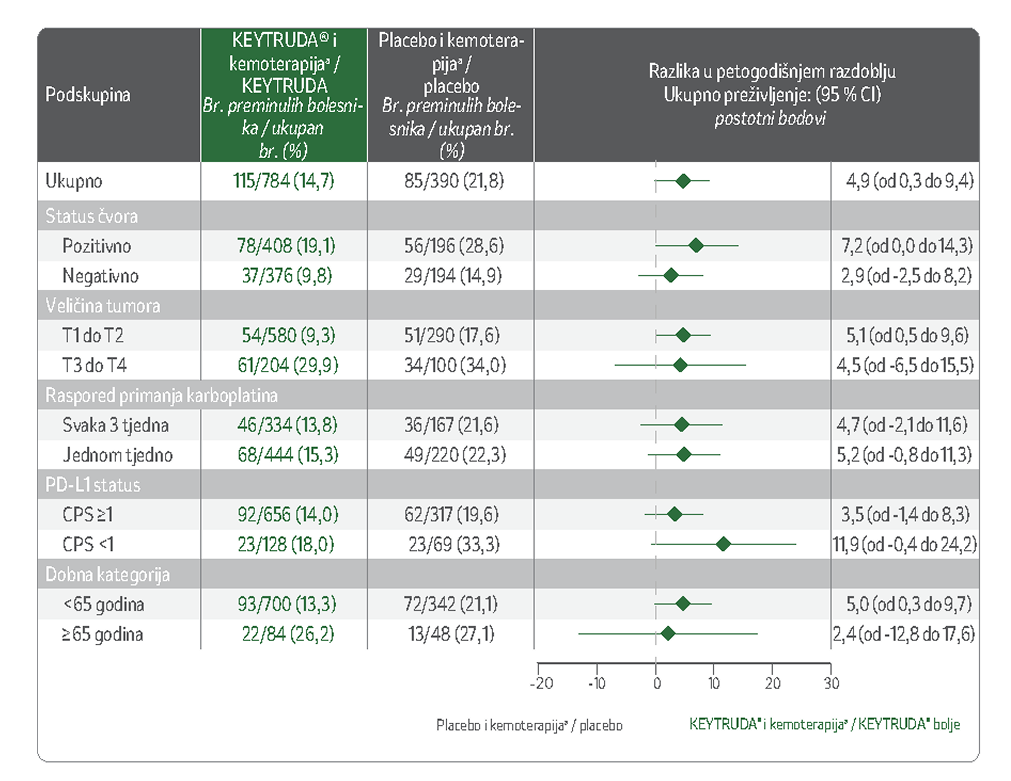 Statistički značajno poboljšanje ukupnog preživljenjah u bolesnika koji su primili lijek KEYTRUDA® i kemoterapijua / lijek KEYTRUDA® u odnosu na placebo i kemoterapijua / placebo.